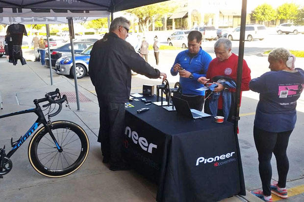 Doug Looney attended on behalf of Castelli and Pioneer and is seen here discussing power meters with an attendee.