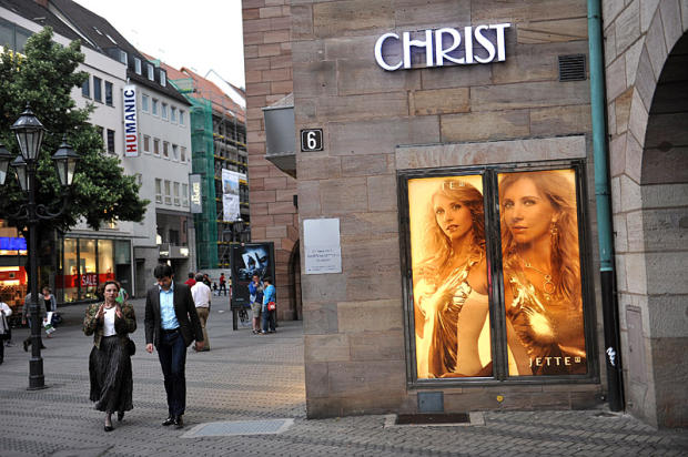 Friends walk together past one of Nuremberg's many sculpted doorways