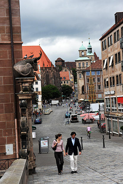 A couple walk the scenic streets of Nuremberg's old city.