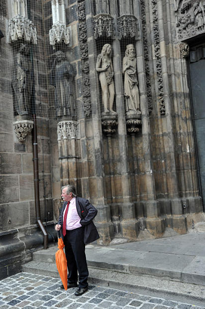 Businessman waits at the doors of St. Lorenz Church, adorned with 13th century sculptures.