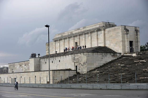 The now-crumbling tribune overlooking the Zeppelin landing field area, used as a centerpiece of the 1933 Nazi rallies. When Hitler spoke, the tribune was an imposing white platform designed by architect Albert Speer to present an image of power. When the Allies took control of the city after Germany's defeat in 1945, they blew up Nazi symbols of swastika and the golden eagle that crowned the tableau.
