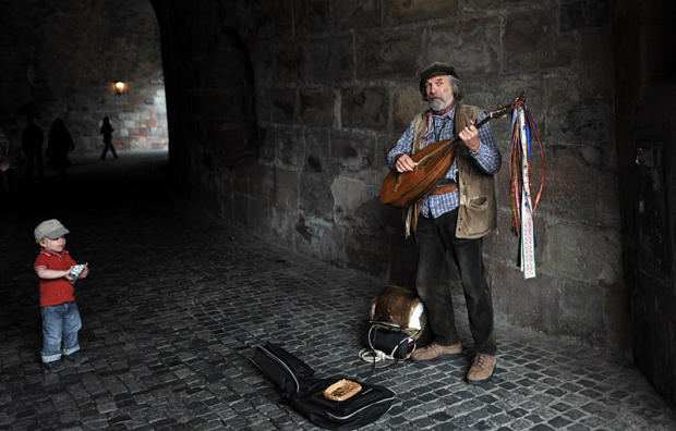 Troubador plays Bavarian folk music to a young listener in a tunnel leading the Nuremberg city castle. Great acoustics.