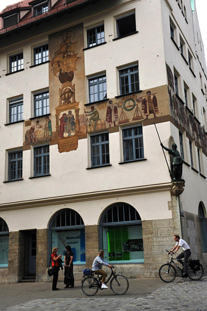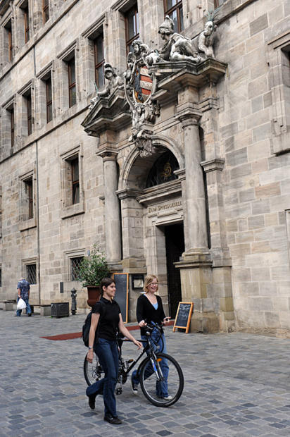 Typical traffic – ubiquitous bicycles and pedestrians criss-cross in all directions in Altes Nuremberg. Elaborate pictures and symbols of ancient heralds decorate the building behind them.