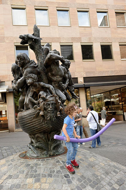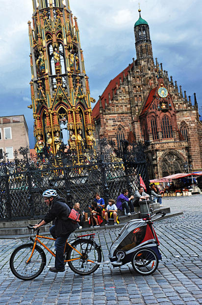 Father on bicycle tows his child past Nuremberg's famed Beautiful Fountain, a 20th century replica of a 14th century masterpiece, a carved 62-foot-high spine wrapped in a Renaissance grill of many figurines. Lore has it that good luck will follow those who turn a golden ring three times on the grill. Overlooking this scene and a nearby open air market is the magnificent 14th century Women's Church.