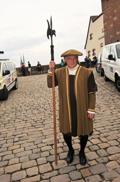 A re-enactor about to participate in a ceremony atop Nuremberg's castle redoubt which sits atop the city.