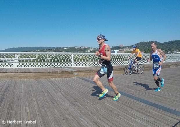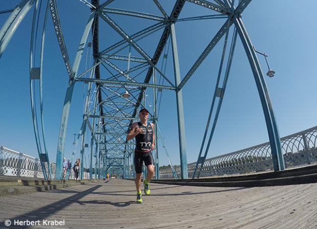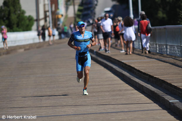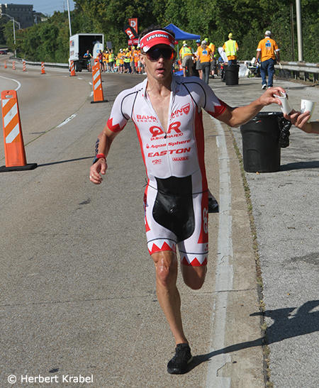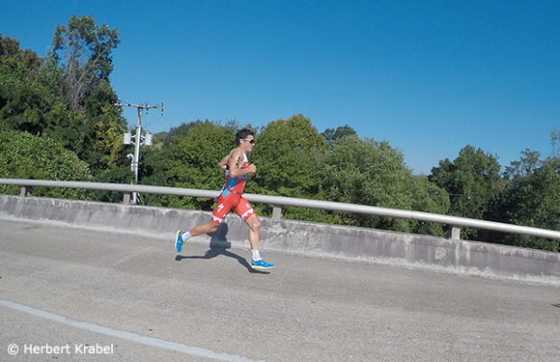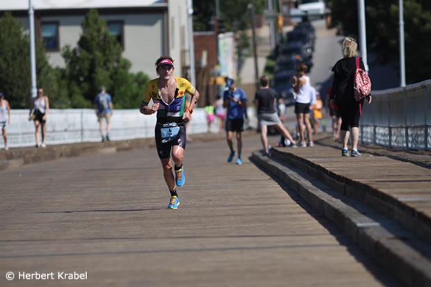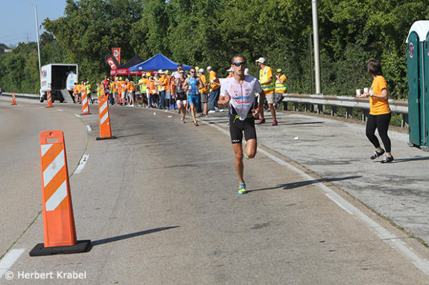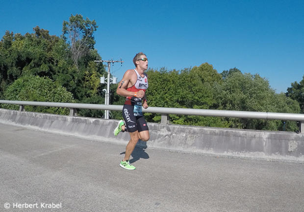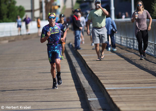 Ben Kanute hung tough with a 1:16:24 run to finish second. As he crossed the walking bridge the last time an age grouper attempted to keep pace.