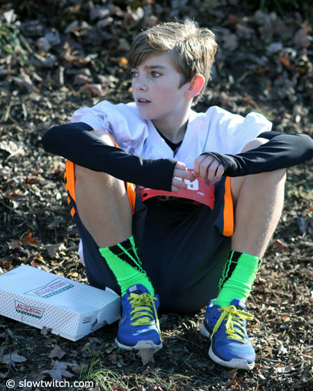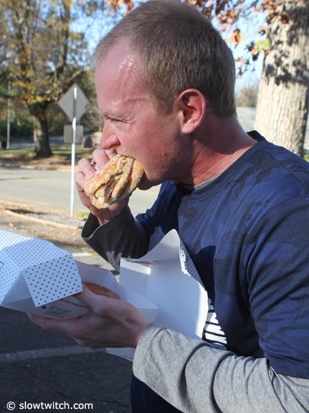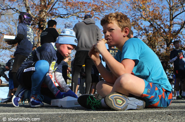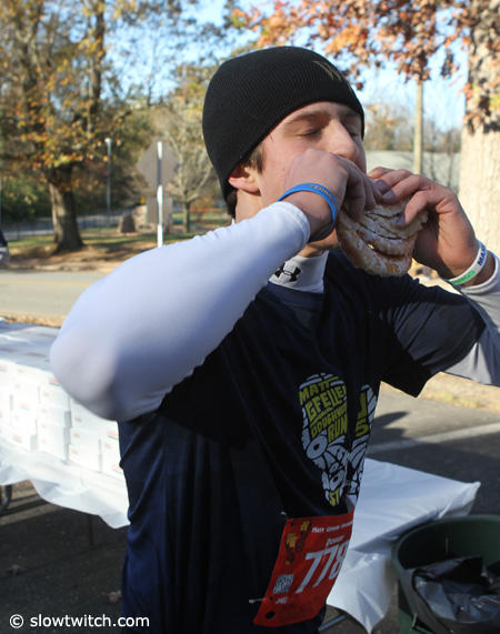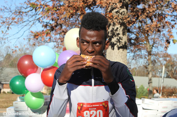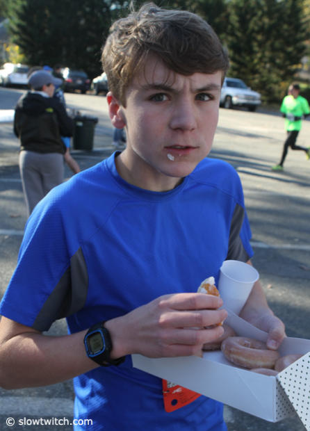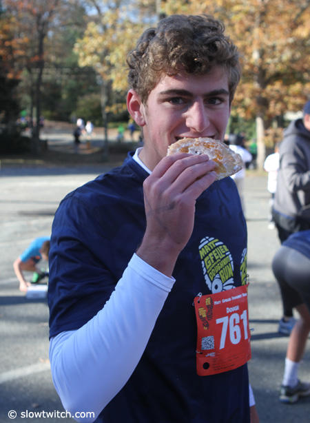 15-year old Anderson Ward likely set some kind of record. He was first to the donuts in only 8:25 but he spent 21:53 eating them and then labored home in 15:05 for a total time of 45:23.