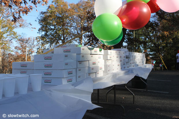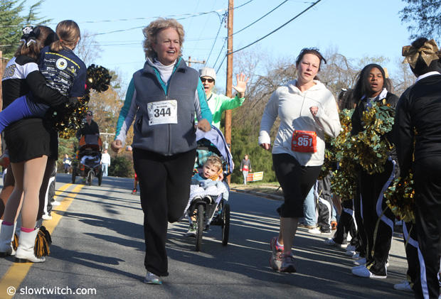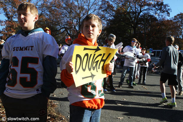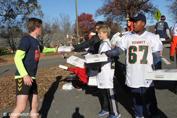 Matt Gfeller died in August of 2008 after a helmet to helmet collision in a varsity high school football game, and in his memory this run has been organized every year since. Matt liked donuts and Krispy Kreme is based in Winston-Salem, that is how it all began. Thanks to corporate sponsors the race entry fees go in their entirety to the Matt Gfeller Foundation. The race itself is 5k and at the halfway point runners who signed up for "with dough" get to eat 6 regular glazed Krispy Kreme donuts before starting the return trip to the finish. Plenty of folks just want to support the race but don't want to eat that many donuts, so they thus can run with "no dough." Here now are impressions from the event today.