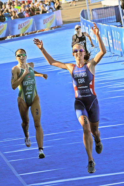 Non Stanford exults in beating Emma Moffatt in a sprint to the line for the silver.