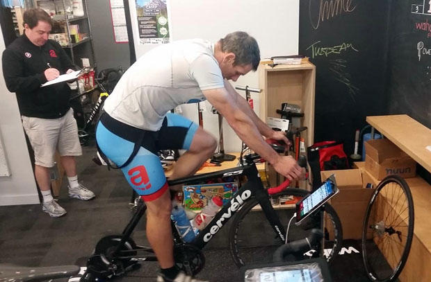 Inside Athletes Lounge, Wahoo Fitness had a Power Challenge contest running throughout the day. Brian Falotico is Athletes Lounge’s Warehouse Manager on this day records riders 3-minute power outputs.