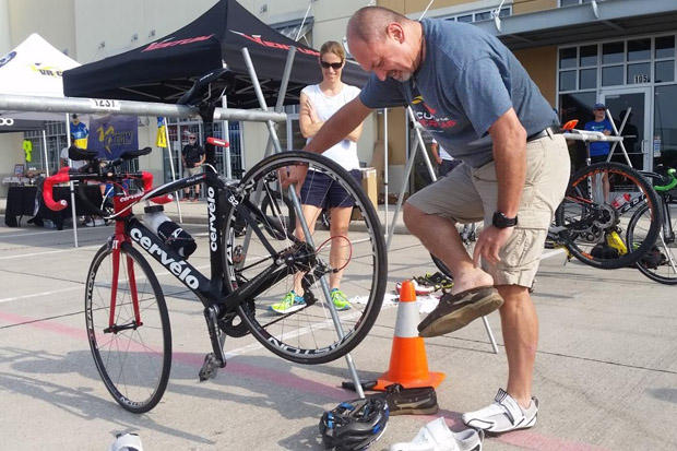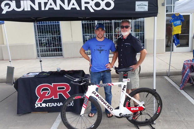 Former Marine Preston Hernandez didn't know how to swim seven months ago when he signed up for IRONMAN Texas, but with guidance from Gemma Hollis he completed the 2.4-miles last weekend in 1:37. Hernandez recently purchased a Quintana Roo from Bike Lane and was thrilled to meet Trey from the company.
