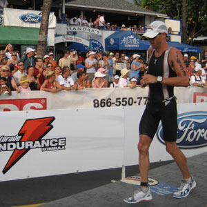 John: My training has varied throughout this past year. First I trained for an Olympic distance race, then a 70.3, and then qualified and increased the training for the Ironman in Kona. The swimming has been cut back. I train about 10K a week until 2-3 weeks out of a race. Then I try to get in around 20K. Much different from the swimming days when I would do that much in a day. Leading up to Kona I got up to around 16hrs for peak weeks on the bike, and about 50mi on the run.