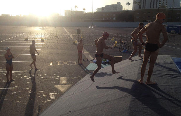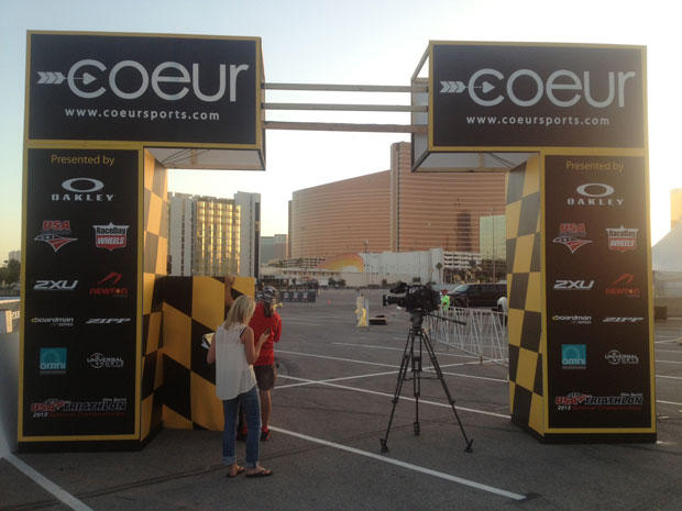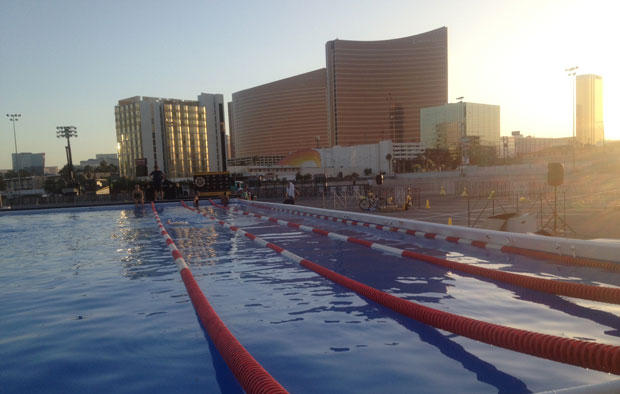 The event takes place in the Las Vegas Convention Center parking lots of Convention Center Drive and is about 3.3 miles from the Mandalay Bay Resort & Casino. The athletes swim 300 meters, bike 5 miles and then run a mile, then get back into the water for another 300 meter swim, bike 5 more miles and then the final 1 mile run to the finish. It is a very unique event indeed with great talent and we highly recommend this event.