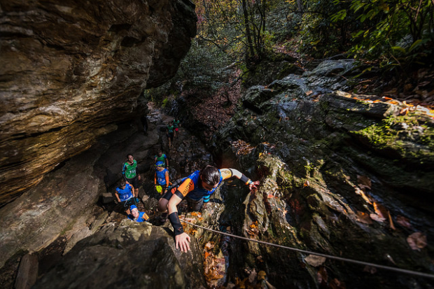 When confronted with impressive elements of nature even racers will sometimes stop to take it all in. The final swim of the SwimRun NC starts right next to a massive rock formation.