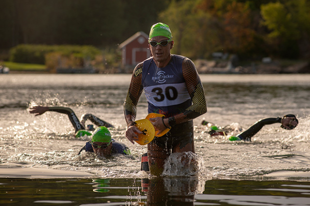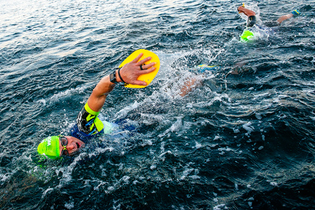 Team Ironingman Xtd 2 with Jørgen Johannessen and Jo Gravås emerge after another swim. They ended up 11th in the male division in 8:18:16