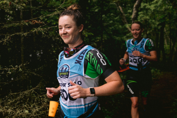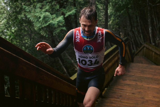 Pro triathlete David Thompson’s teammate injured himself on a trail run early during race week so the Minnesotan opted to race the Long Course Solo division. Thompson led the race wire to wire and is seen here pushing hard up a section of stairs leading up to Arch Rock.