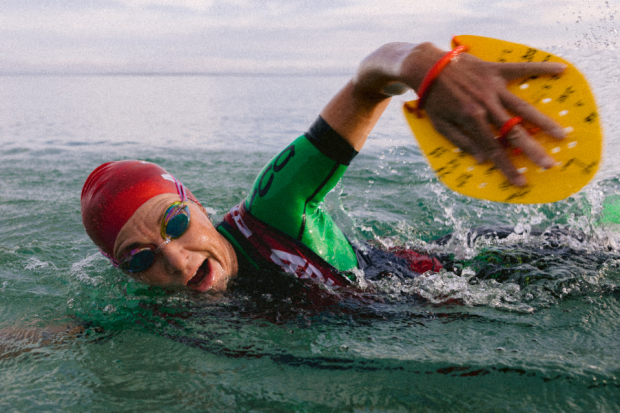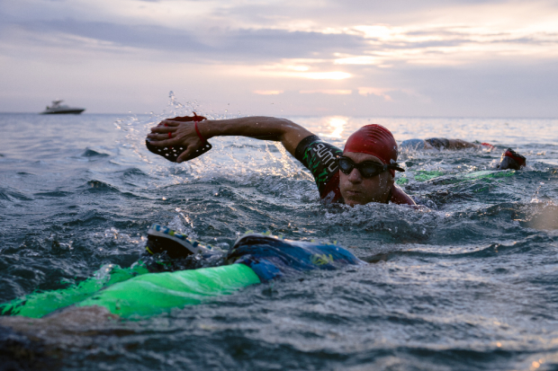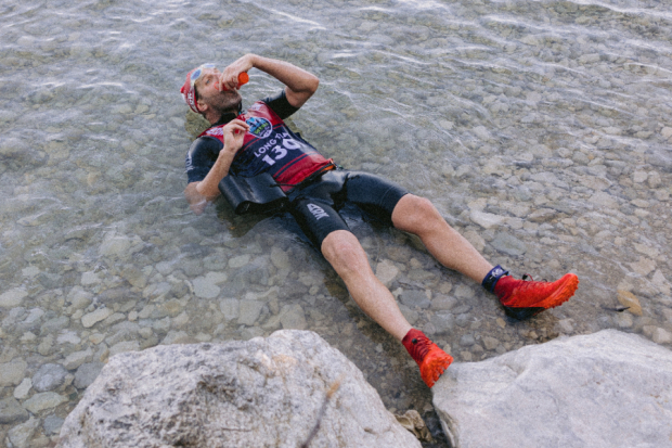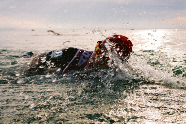 Benjamin Siems of Team Kalamanders opts to stay cool for a few extra moments at one of the swim exits.