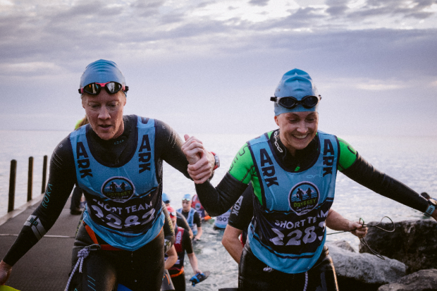 A team exits the second swim leg to a spectacular view of Arch Rock with the 207 steps staircase up ahead.