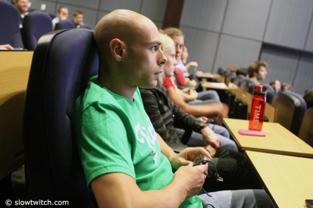 A very attentive audience tries out the features of the Run Trainer 2.0.