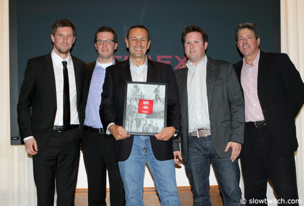 Peter Hurley and Mac McEneaney accept the Timex Game Changer award for the Quintana Roo bike brand from Tom Schuler, Tristan Brown and Keith Meyer.