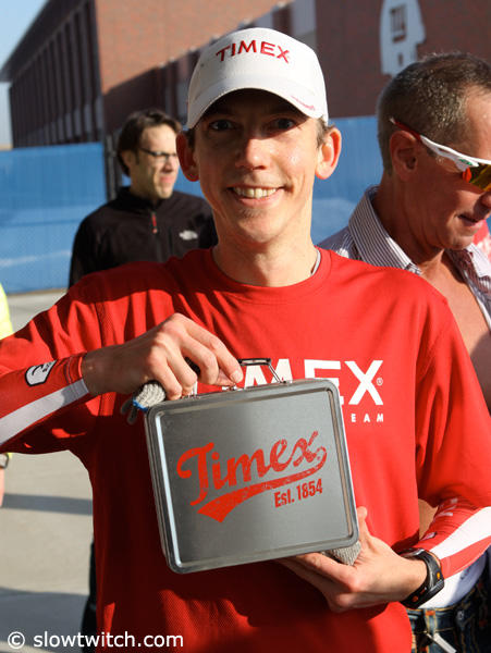 Andrew Hodges with the cool post run swag lunch box.