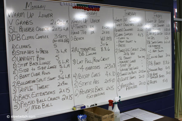 The workout schedule for the rehab football players is on the board.