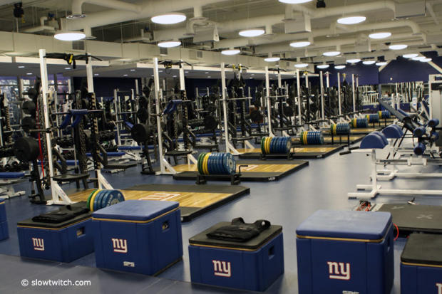 A very impressive weight room has no small weights and quite a few 100 pound dumbbells.