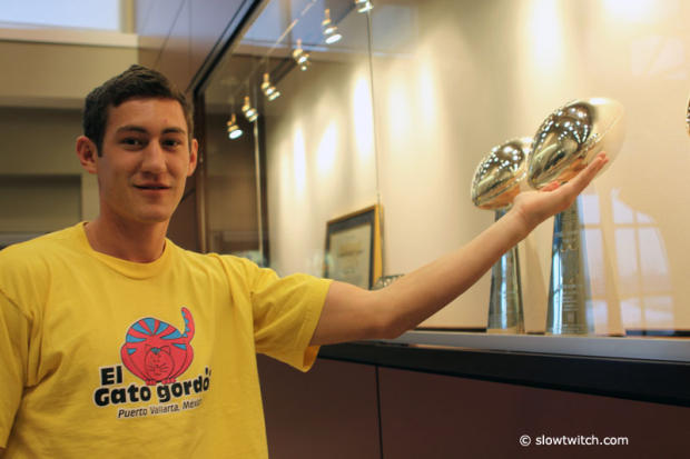 The locker room is shaped like a football, and the team Timex guys will be using it the next few days.