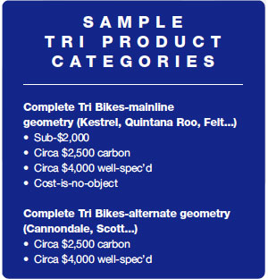 The first, best thing you can learn is: There is no single brand of bike or wetsuit you must have in your store. You, the retailer, are the brand. Customers will flow to you, or not, based on what you know more than what you sell. Think less about bike and wetsuit companies, think more about bike and wetsuit categories. One such category might be the circa-$2,200 carbon-frame complete tri bike. Felt, Quintana Roo, Cervelo, Kuota, Cannondale and others all make ready-to-ride carbon bikes within $300 on either side of this price. Less important than the brand of bike in your store is whether you have any bike in this category in your store. This is an important category; best if you're not shut out here.