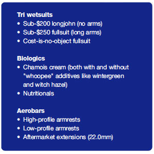 Just as in road race, triathlon has predictable categories. What about a largely Dura-Ace or SRAM Red tri bike in the $3,500 – $4,500 price range? Then there's the cost-no-object bike; the sub-$200 sleeveless wetsuit; the entry-level full wetsuit; the cost-no-object fullsuit.
