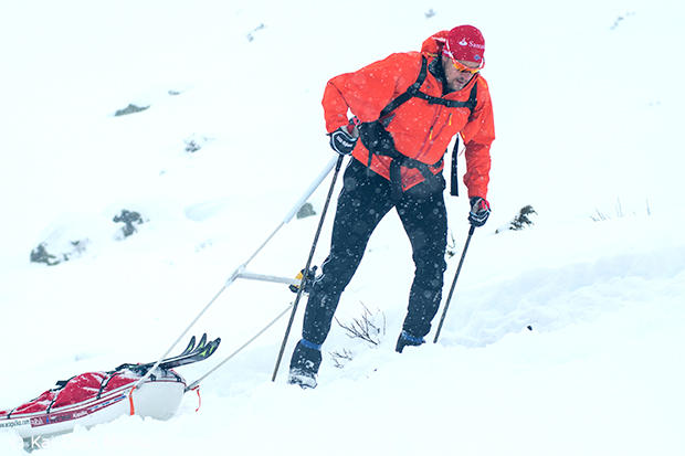 Pushing up a climb in blinding conditions.