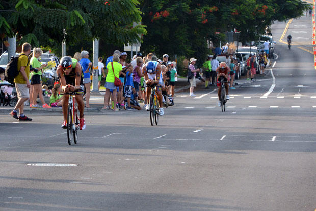 Jordan Rapp, Andreas Raelert and TJ Tollakson heading towards the Queen K from the in-town turnaround. By Bill Greentree
