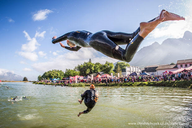 While everyone else dives in properly to start lap two of the swim, there is always someone who dive bombs for the crowds. By Chris Hitchcock