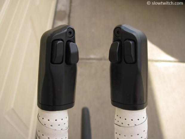 Sarah prefers to angle the shifters so she can operate both buttons easily with her thumbs.