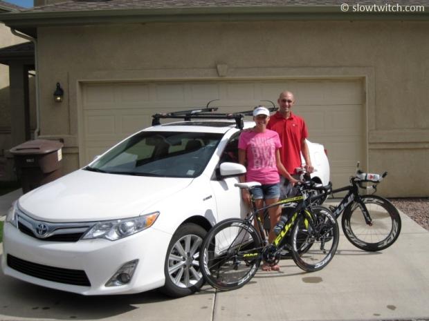 This crew looks ready to race – Sarah, Nate, her two bikes, and their Toyota Camry hybrid.