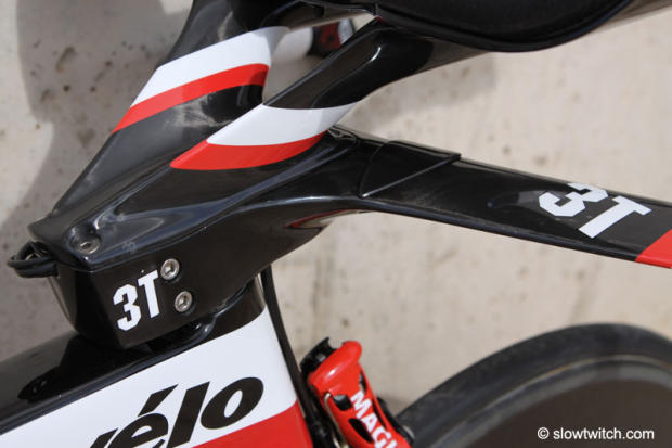 The P5 seat tube head tube and fork were designed with the brakes and create a very long head tube chord, improving aerodynamics and stiffness. The seat tube chord is almost twice as long as the one on the P4 and actually almost nothing else reminds us of the P4 or any other Cervelo. The new aero bar developed with 3T has seemingly shown good wind tunnel numbers, allows the rider to hide the cables 100% and comes in three different heights, X-Lo, Low and High V, giving the customer thus quite a good range of fit options. However, should the customer prefer a different type of aerobar, he or she can easily do so since standard stems and headsets will fit on that P5.