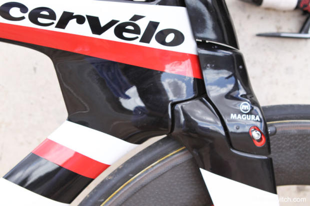 For this bike Cervelo also reached out to a brand that isn't very well known in the world of road cycling, but quite popular in the mountain biking arena. German hydraulics specialists Magura developed an ultra light and powerful hydraulic brake named RT8TT with heavy input from Cervelo, and that brake also uses a standard center bolt mount, so consumers could add on a different brake, but why anyone would want to do that would somewhat puzzling. Slave cylinder for these RT8TT brakes sits vertical between the arms and the master cylinders are inside the base bar. Claimed weight for the complete system is a staggering low 495 grams for the set. The new Magura brake will be initially exclusive to Cervelo. But by Eurobike 2012 other brands will be able to show this new brake on their 2013 models. The Magura brake will start shipping separately to Magura dealers in April 2012 and to other dealers a couple months later.