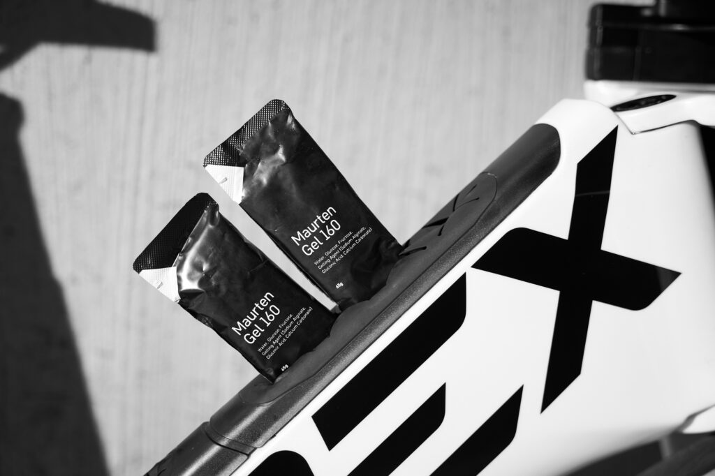 - Maurten Gel 160 packs stashed in the integrated top-tube compartment