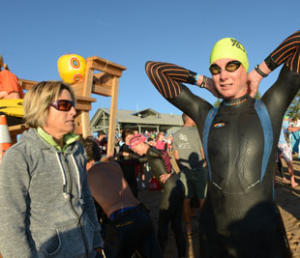 ST: Thirty five miles into the bike leg, Rinny wasn’t in the first pack. Was her early pace OK?