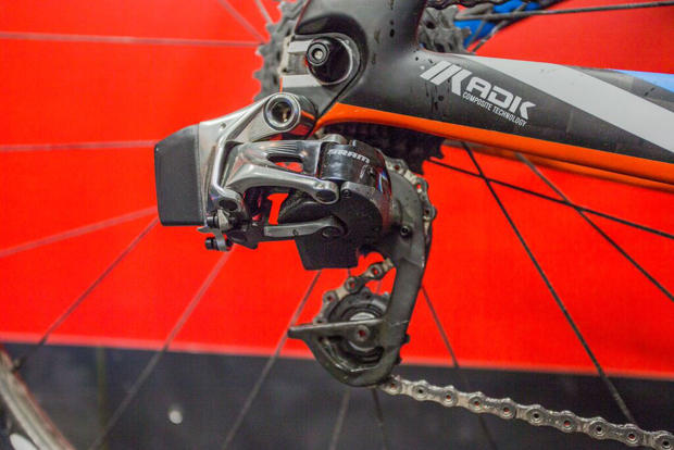 A closer look at the SRAM electronic rear derailleur. No cables in sight.