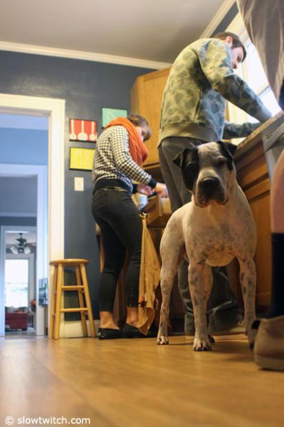 Last minute preparations in the home of Travis Livermon before heading out of town. Booger the dog belong to Megan, the girlfriend of Livermon, and they two will come.