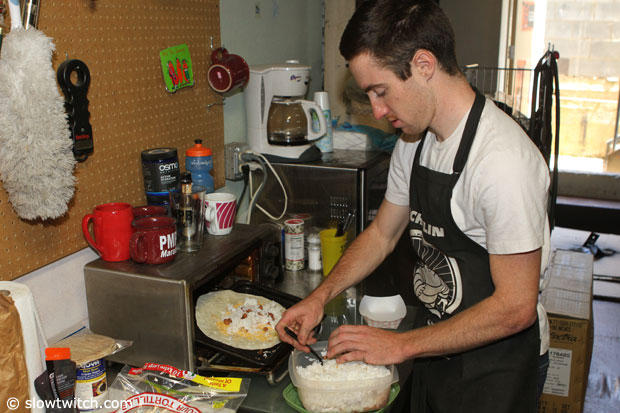 At lunch time Alex prepares a special burrito, versus going out and just grabbing lunch. More so about money spent versus special dietary needs.
