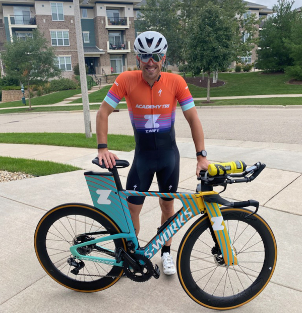 Eric: I thought you’d never ask! As some people know, I was selected for the 2021 Zwift Academy Triathlon team this year. A few weeks ago, we got our custom-wrapped S-Works Specialized Shiv Disc bikes. Our Shivs have Dura-Ace Di2 shifting, dual-sided Specialized Power Cranks, hydraulic disc brakes, and Roval CLX 64 Disc wheels. I was able to borrow a Roval 321 disc wheel, which thankfully arrived the day before the race. They say try nothing new on race day, but it was the day before the race so why not!
