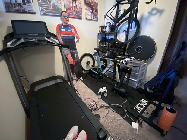 Eric: Living in Wisconsin, I do a lot of indoor training. I do all my weekday rides indoors and my long ride outdoors on the weekend. I really enjoy getting in a solid workout without having to worry about stop signs, traffic and weather. I have a studio apartment so my pain cave takes up about half of my living space. I purchased a treadmill last winter that has been an essential part of my brick workouts and winter training. As far as my bike set -up, Wahoo really hooked up the Zwift Academy team with a Wahoo KICKR, Headwind, and Climbr. I have a 32” flatscreen positioned in front of my bike which I use for Zwift.