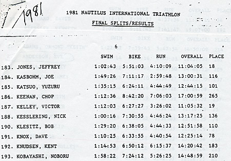 Upon checking the tattered Xeroxed copy of the 1981 Ironman results, the splits listed for Joseph Kasbohm's 13:00:31 finish add up to 12:00:31. A member of the 1981 Ironman timing team who handled the swim splits only and not the final compilation offered the following probabilities. First of all, the final finish time is most likely accurate. Second, he verified all swim times. Finally, since the sum of the swim, bike and run splits are precisely one hour off, he says the most likely probabilities are that either the bike was 8:11:17 not 7:11:17, or the run was 3:59:48, not 2:59:48. "I'd say it is 50-50 where the mistake lies," said Dr. Fred Sayre, a Kailua-Kona dentist who was in charge of Ironman timing from February 1982 to 1989.