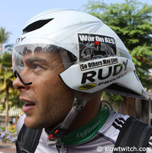 Matt: I just taped a clear visor to my Rudy Project helmet and it works pretty slick! When I wear sunglasses sweat gets in the lens and it’s difficult to see. The visor does the trick and when I get into T2 I pop on a fresh clean pair of Rudy Project Sunglasses.