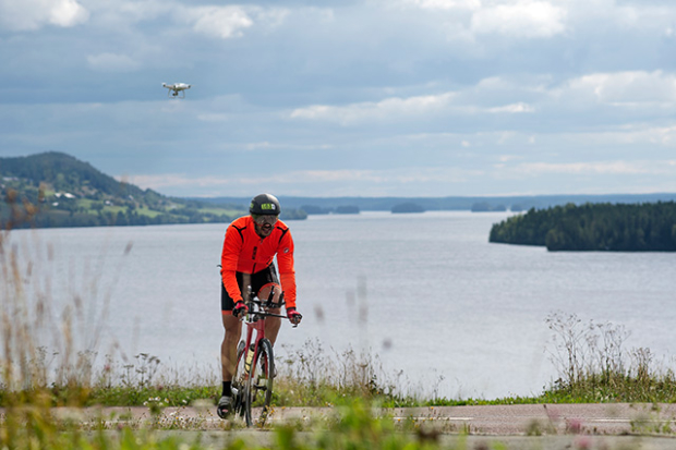 After swimming 3.8 kilometers in Öster-Noren athletes finish at Sweden's largest waterfall, and this waterfall makes a great landmark. This picture here however was taken the day prior when athletes were checking out the course. Norwegian Espen Simonstad who is fairly new to triathlon opted to participate in this challenging race.