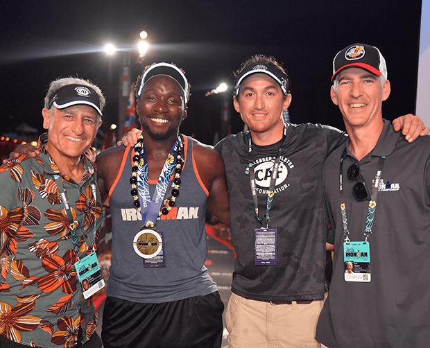 RS: I definitely see myself being involved in health and wellness. I want to do more motivational speaking. And the small business we’re running out here, Tailwind Endurance. Hopefully make it a franchise. Lots of countries, especially in Europe, where it gets cold and people still want to train indoors. Hopefully see that take off. I want to do more with Challenged Athletes Foundation. Obviously they have a big big base in California. The West Coast. But not much of a big base out here. [Below is, from left, Bob Babbitt, Roderick Sewell, Rudy Garcia Tolson, and Earl Watson from Tailwind Endurance, at the finish of the Hawaiian Ironman.]