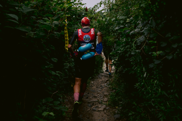 Marsh follows Wolek’s lead through a narrow singletrack trail as the eventual winning women’s team makes their way down to the first swim leg of the day between Peaks and Cushings islands.