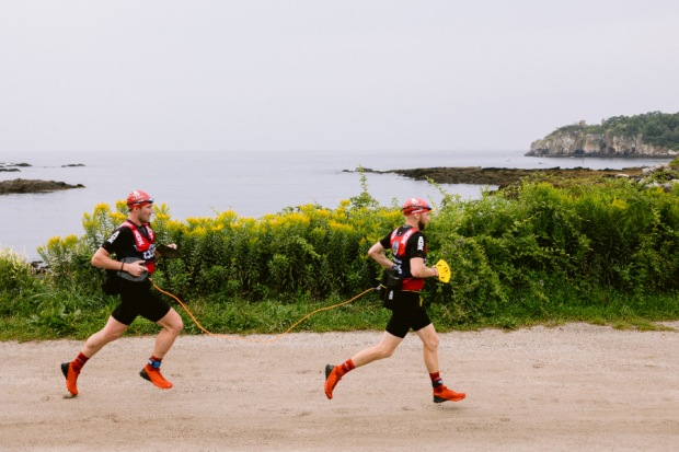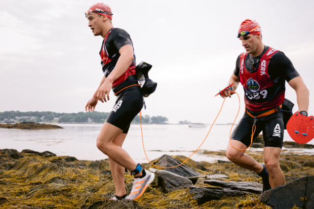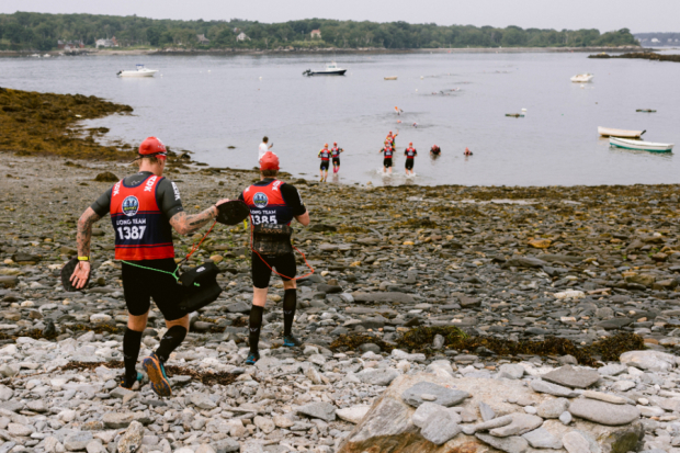 Matthew Kaiser and Adam McNally from Team Jersey Buoys reach the finish line of their Short Course effort, 12 total miles covering four islands in the Casco Bay chain. 10 total miles of running and 2 total miles of open water swimming.